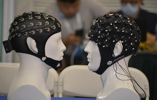 圖為2021世界機(jī)器人大會(huì)上展示的腦機(jī)接口技術(shù)(2021年9月12日攝)。(新華社記者李欣攝)